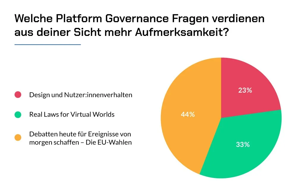 Nachdem die Abstimmung über mehr als zwei Wochen für euch geöffnet war, ist das Ergebnis knapp, aber eindeutig. Mit 23 Prozent der Stimmen landet das Thema Design und Nutzer:innenverhalten und auf dem dritten Platz. Knapp davor liegt mit 33 Prozent das Thema Real Laws for Virtual Worlds an zweiter Stelle. Die Abstimmung gewonnen hat mit knapp 44 Prozent das Thema Debatten heute für Ereignisse von morgen schaffen – Die EU-Wahlen.
